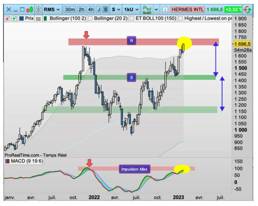 La tendance (canal bleu) est toujours évidemment haussière mais actuellement, Hermès teste une fois de plus (flèches orange) la résistance de ce canal qui se conjugue avec le passage de la « zone à risque » des 1 700/1 750 €.