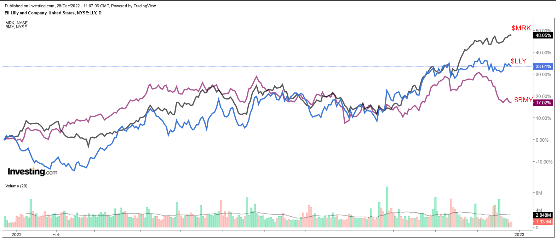Espero que las acciones de Eli Lilly, Merck y Bristol Myers Squibb sigan superando al mercado en general en 2023. Las tres empresas ofrecen una rentabilidad por dividendo relativamente alta y siguen estando razonablemente valoradas, lo que las convierte en atractivas apuestas defensivas en el actual contexto de mercado.
