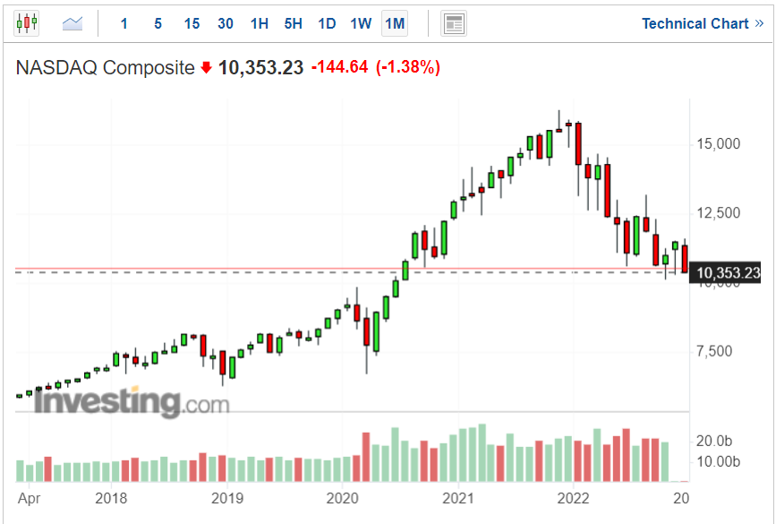 El Nasdaq Composite, que ha luchado en territorio de mercado bajista durante gran parte del año, ha caído un 33.8% en lo que va de año y un 36.1% por debajo de su máximo histórico del 19 de noviembre de 2021. Lastrado por las fuertes caídas de las acciones de empresas tecnológicas de gran capitalización que habían liderado las subidas de los mercados en años anteriores, como Tesla (NASDAQ: TSLA), Amazon (NASDAQ:AMZN), Apple (NASDAQ:AAPL), Nvidia (NASDAQ:NVDA), Netflix (NASDAQ:NFLX) y Meta Platforms (NASDAQ:META).