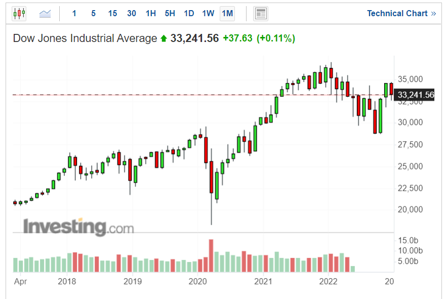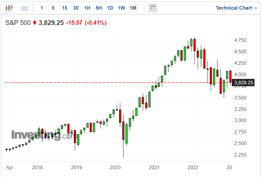 El S&P 500 ha bajado un 19.6% a pocos días de cotización, lo que supondría su mayor caída anual desde la crisis financiera de 2008, entre temores de que el agresivo endurecimiento monetario de la Reserva Federal para combatir la inflación hunda la economía en la recesión. El índice de referencia se encuentra aproximadamente un 21% por debajo de su máximo histórico alcanzado el 4 de enero de 2022, cumpliendo la definición técnica de mercado bajista.