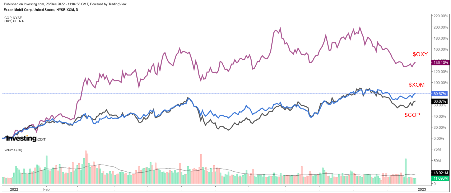 Ante la previsión de nuevas turbulencias en 2023, recomiendo comprar XOM, COP y OXY, dados sus sólidos fundamentales, valoraciones razonables, balances saneados y enormes reservas de efectivo.