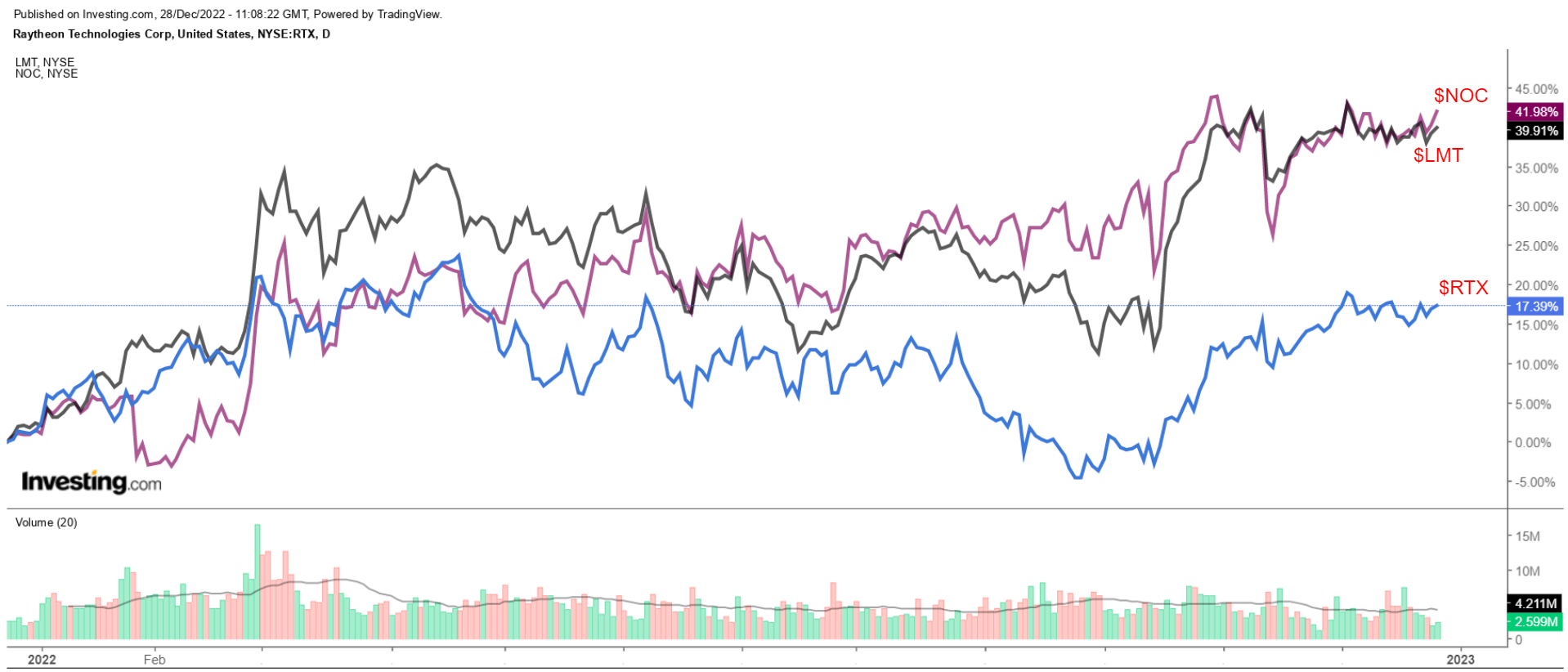 RTX, LMT y NOC continuarán su marcha ascendente en 2023, ya que los tres gigantes de la defensa siguen bien posicionados para beneficiarse de los crecientes presupuestos de defensa gubernamentales y militares debido al actual entorno geopolítico mundial.