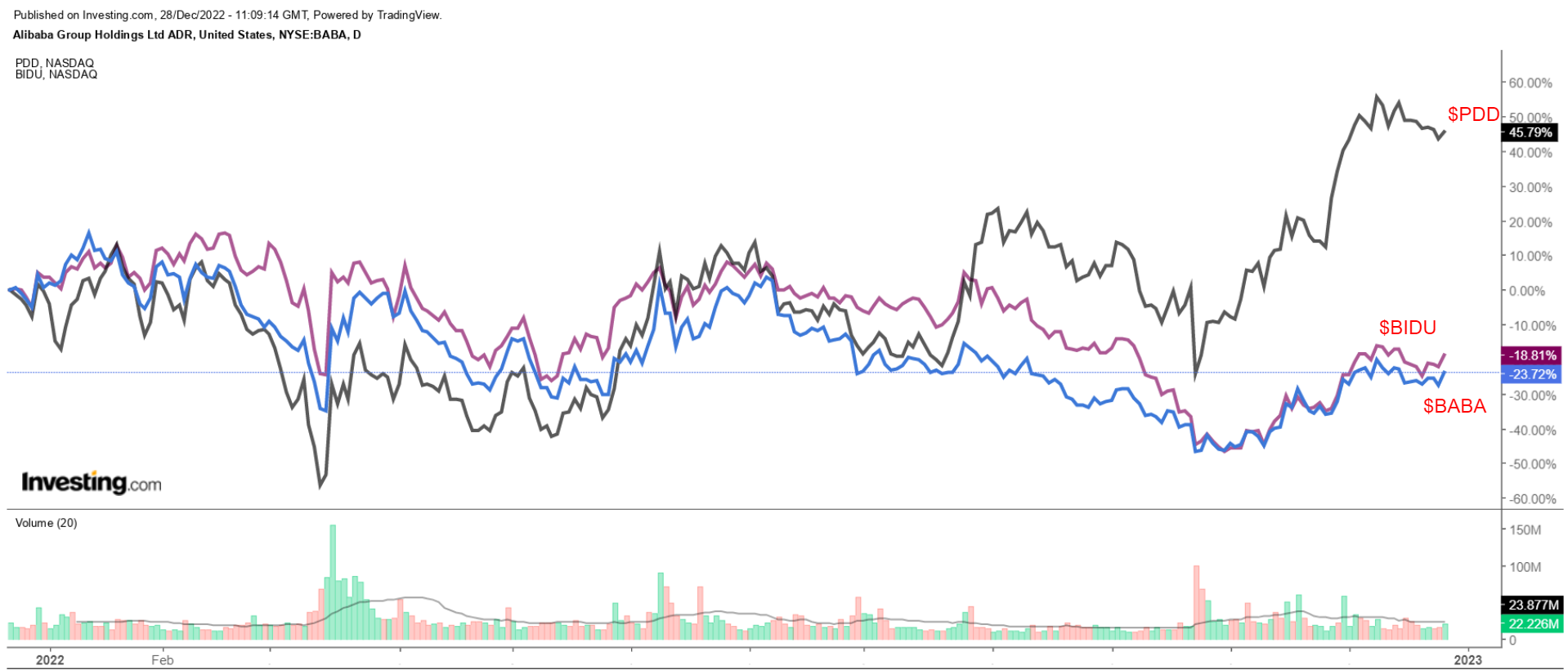Preveo que las acciones de Alibaba, Pinduoduo y Baidu repuntarán en 2023 tras su brutal venta masiva medida que lo peor de la represión reguladora antitecnológica del presidente chino Xi Jinping parece haber pasado por el momento y la economía del país se reabre tras los estrictos confinamientos relacionados con la COVID.