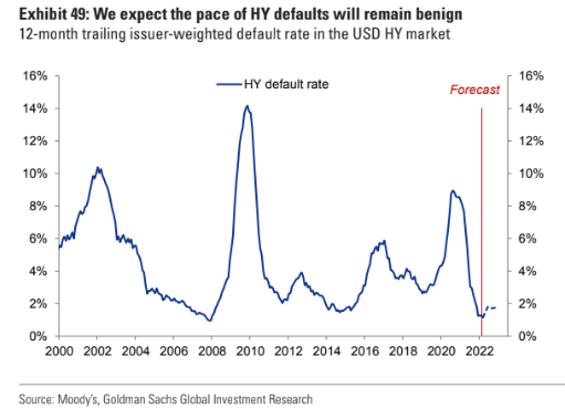 Moreover, the bears often point to an impending blowout of high-yield spreads, perhaps on the order of what we saw during the Great Financial Crisis or, at the worst of the COVID Crash. Goldman Sachs thinks otherwise, as evidenced in the chart below, which forecasts just a modest uptick in the pace of high-yield defaults.